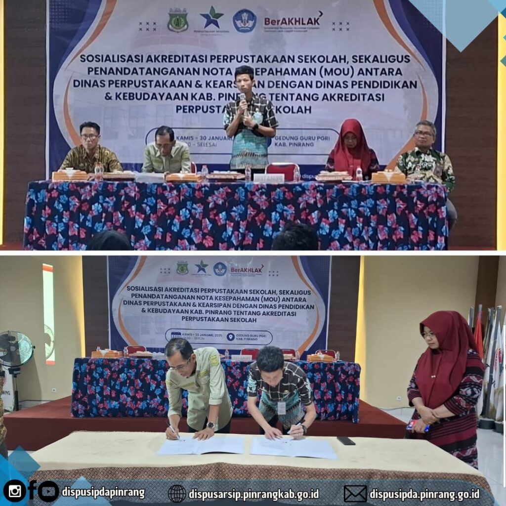 Sosialisasi Akreditasi Perpustakaan Sekolah, Sekaligus Penandatanganan Nota Kesepahaman ( MoU ) Antara Dinas Perpustakaan & Kearsipan dengan Dinas Pendidikan & Kebudayaan Kab. Pinrang Tentang Akreditasi Perpustakaan Sekolah di Gedung PGRI Kab. Pinrang